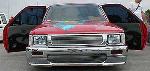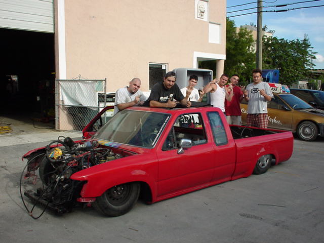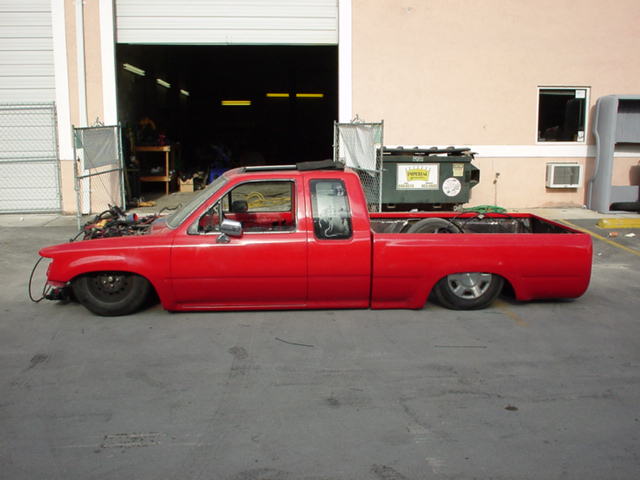 Toyota Super Red paint, graphics on hood, cowl and tonneau cover, shaved:hood squirters, antenna, wipers, rock guards, tail lights, tailgate, door handles and gas door. suicide doors, l.e.d. tail lights, flip down tag in the tailgate skin with the new gas door behind it, sliding ragtop, fiberglass tonneau cover, 4x4 fenders and all chrome 4x4 bumper, valance and grille with billet insert