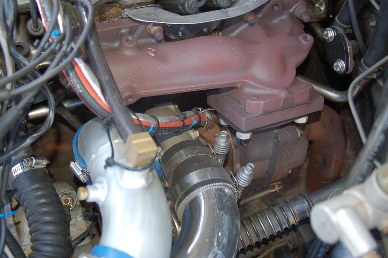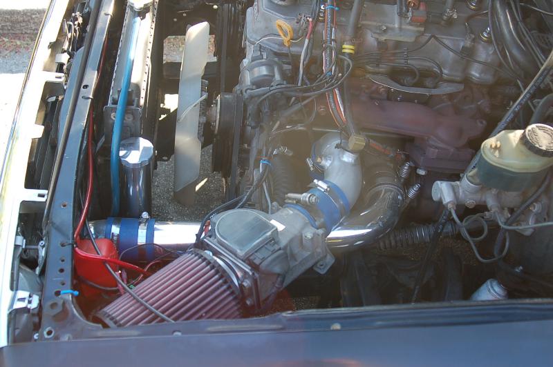 Stock 2.4L 22RE, Custom Garrett GT25R turbo setup, TiAL blow-off, AEM F/IC,intercooled, custom intake, relocated wire harnesses and items over inner fenders, inner fenders removed completely, clutch master cylinder relocated beneath dash, relocated Optima battery (yellow top), fully TIG welded Magnaflow exhaust, relocated gas tank beneath bed, Clutch Specialties Stage 1 clutch disc/pressure plate, DOA Racing timing chain with metal guides, Garrett boost gauge