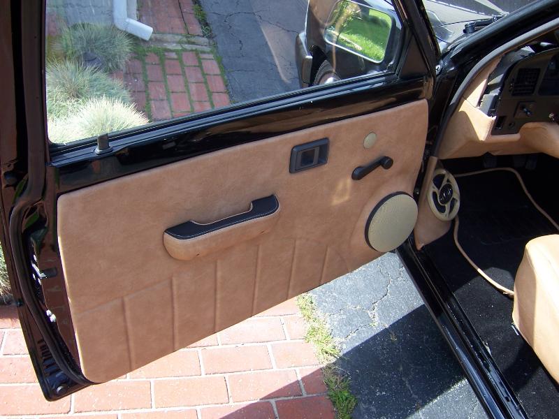 Stock bench seat reupholstered with removed headrests, carpet replaced and sound deadened, door panels reupholstered with fiberglass speaker pods, dash upholstered, BAD Carnage steering wheel with matching interior wrap, custom cantilevered clutch master cylinder beneath dash, LC Engineering shift knob and short shift kit, floorpan modified for driveshaft clearance, firewall tubbed for wheel clearance, custom molded fiberglass kickpanels, headliner and sunvisors upholstered to match, custom fiberglass rear speaker pods, Billet Specialties window cranks, grab handle, and courtesy lights