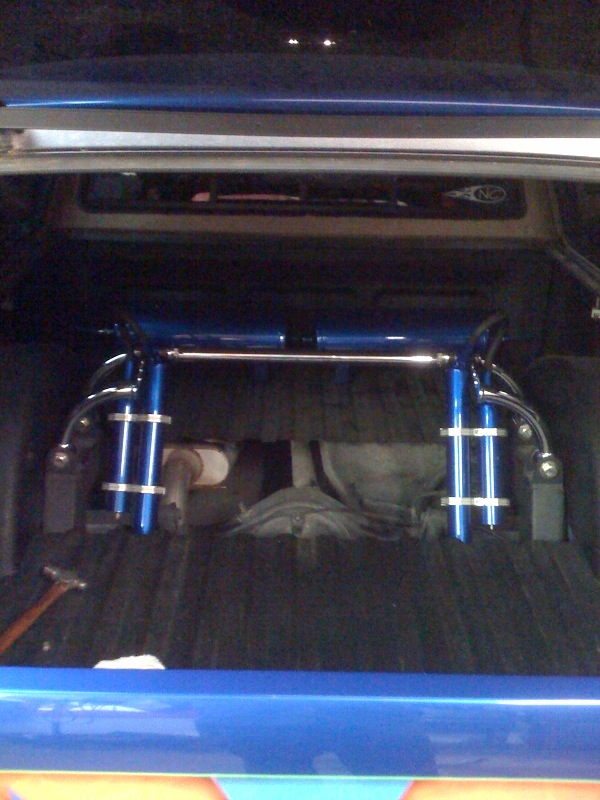 Bagged, 4 link,front fender wells, rear fender wells, off road shocks with reservoirs, SMC valves, 2 Thomas compressors. Still need to move up front x member.