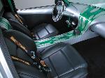 Hand-fabricated steel dash and center console painted to match the exterior. Seats are out of a '96 Honda Prelude sans headrests with modified seat mounts and wrapped in black pleather. Additionally, the door panels are pleather-wrapped Masonite with inserts that make the door panels flow into the dash. See the killer steering wheel in the truck? You can't buy it. It was built from a barstool "borrowed" from Josh's parent's house. The center is a piece of plate steel. Once combined and made to fit a stock wheel, the wheel is held to the column via the factory hub nut. The rear frame clip is tied to the in-cab roll cage, a la race truck style, and painted to match the green tribal found all over the truck. The center console is also of Josh's own design, made to flow to the dash, as well as to house the truck's wiring and stereo components.