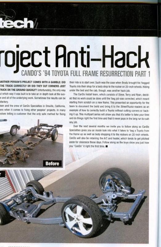 This truck was done to be an example for CanDo customer to follow. Showing how to install the products correctly with out cutting any corners. Street Trucks mag has given it the name Anti-Hack, in a series of build up article. These articles have covered the entire proccess of taking a stock Toyota frame and bagging & bodydropping it tradional style. In a way any one with a welder an sawz-all could do it at home in the Garage. Look for the monthly article.