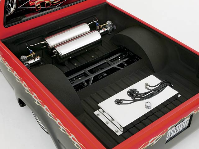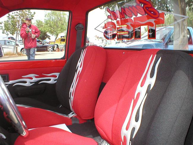 Finish bodywork and paint performed by Ed Warren (Fast Eddie) of FED Customs in Yucca Valley, Ca. Ed painted the truck to match my logo with Spies Hecker Permacon 2002 Audi Lazer-Rot Red and midnight Black two-tone with a metallic silver flame outlined in bright yellow that divides the red and black. Dupont cleared, color sanded and buffed to perfection.