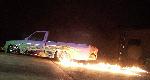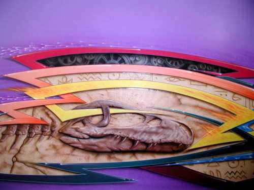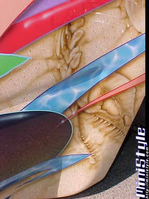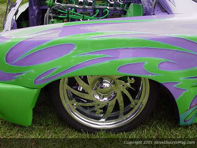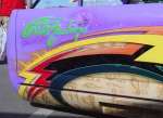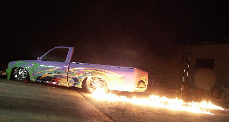 Fully shaved, Custom l.e.d. tail lights Hidden in the graphics, semiphores(turnsignals in the b-pillars), custom mirrors. Custom graphics. "graphic excavation" on the tonnue cover. Custom stained glass rear window. SPECIAL THANKS TO BRAD HOUK FOR HIS WORK ON THE BODY & SUSPENSION.