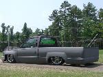 About 4 different colors of primer right now. 4WD bed and front fenders. Cut the roof off and chopped it down so it will be a full time vert from now on. Pulled the doors off and skinned the door openings. Grant Fab tailight fillers, full skin combo out back. Welded and shaved ALL the body/bed seams. Shaved hood pissers, antenna and front corner lights. Chrome 2WD bumper and valence. Sheetmetal bed floor (whats left of it) and boxed the back half, so I can have somewhere to put the beer @ Showfest.