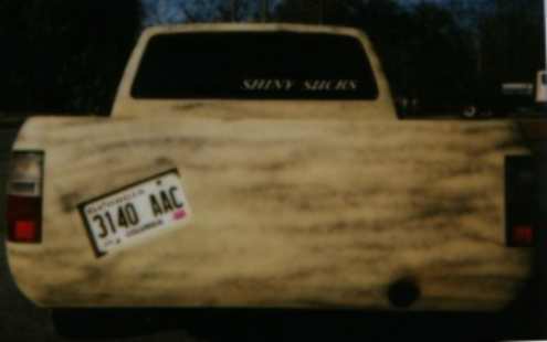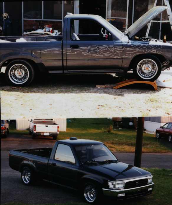 full 4runner conversion..frenched power antennae..4runner side mirrors..shaved and relocated fuel filler door and nozzle...bed tubbed with canted l plate box and frenched exhaust....custom hand made bed cover and taililights ...primer....K-200 for ever shiny sucks