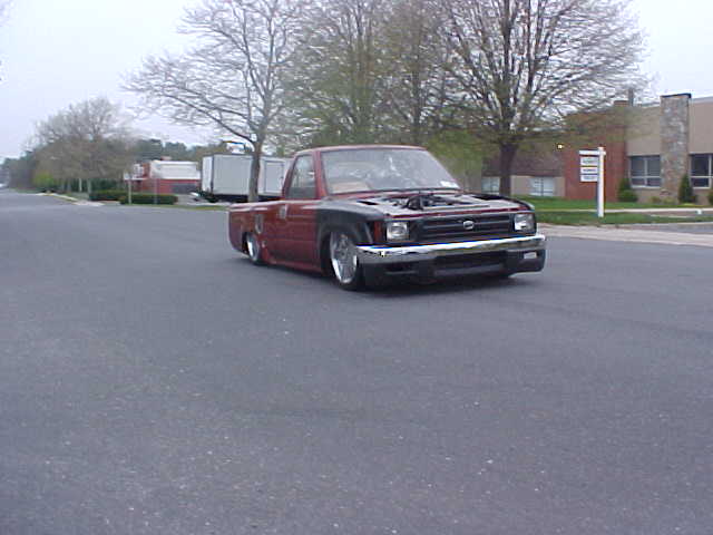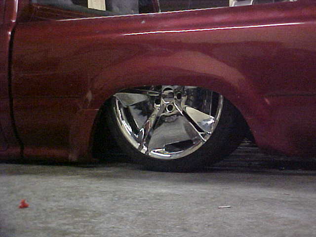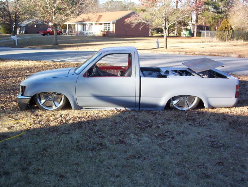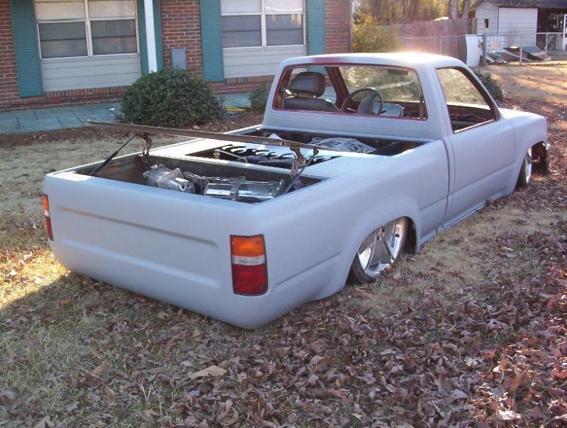 shaved everything,molded cowl into fenders and fenders into rockers,taco front bumper,stock 4x4 fenders,custom sheet metal bed cover with two trunks,box n tube sub frame,tranny crossmember,body dropped n lower'd cab mounts,(b-drop+20's+heat in the north east=cool)