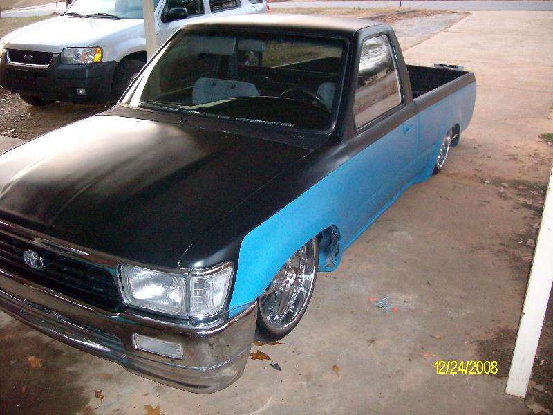 Black and blue right now paint coming soon. Shaved tailgate and roll pan, and antena. 4 runner front end.