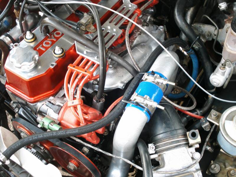 22RTE bottom end with a 22RE head, ARP head studs, engnbldr 270 cam, TEC turbo kit, intercooler, and 10psi of boost. Stock 5 speed W58 celica transmission.