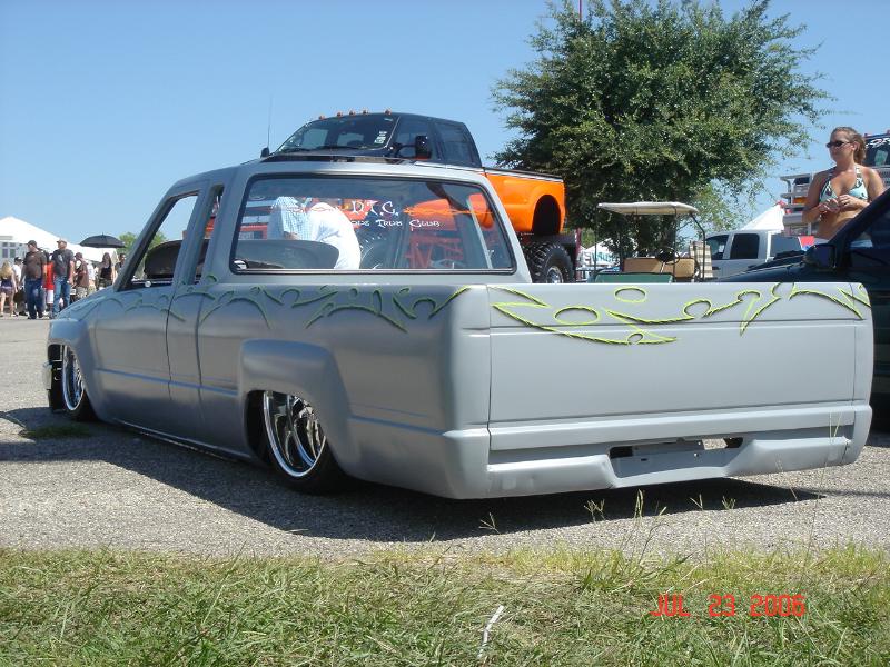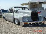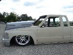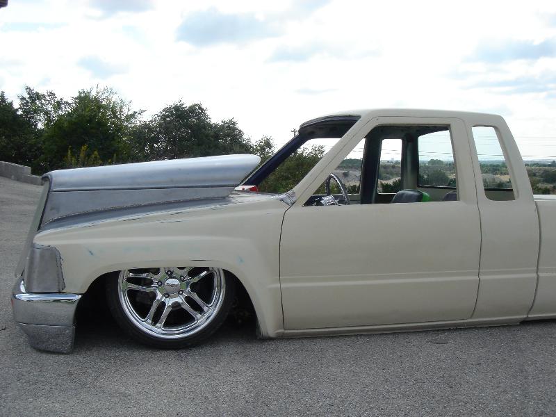 shaved doors, mirrors, wipers, gas door, bed seam, and driprail. closed bed. modified x-tra cab windows. modified, suicide doors. added sunroof and recessed frame. modified 1933 ford coupe hood. custom horizontal grill. toyota tacoma crystal clear headlamps.