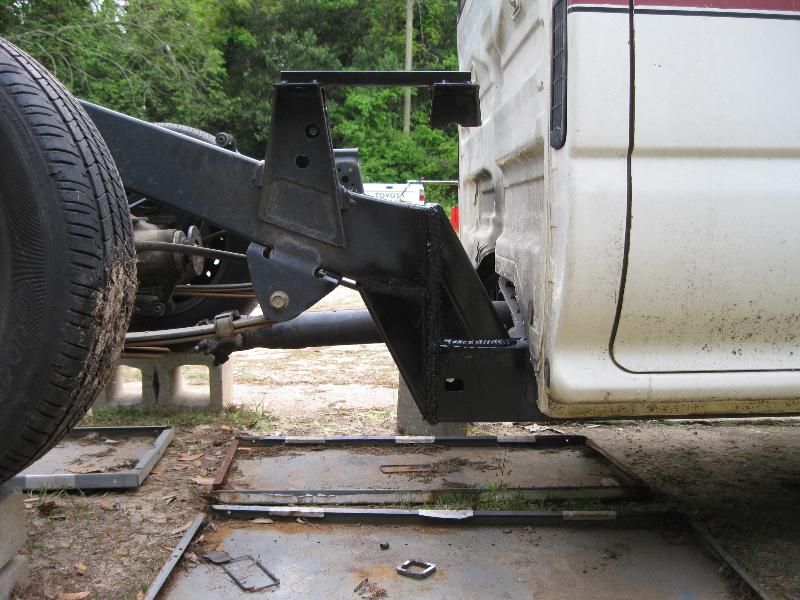 Cranked down torsions, 3" blocks and air shocks in rear.