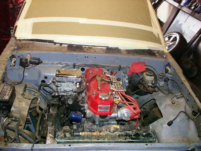 22re converted to carb with a weber, lc eng headers, lc engineering fan painted red to match truck, lc engineering polished water pump pulley, lc engineering billet underdrive pully, lc engineering red powdercoated valve cover, 200 amp gm alternator powdercoated back with chrome pulley and chrome fan, lc engineering polished distributor without vacume advance, billet spark plug wire holder, lc red spark plug wires and cap, msd universal coil, and some chrome and paint in the near future.