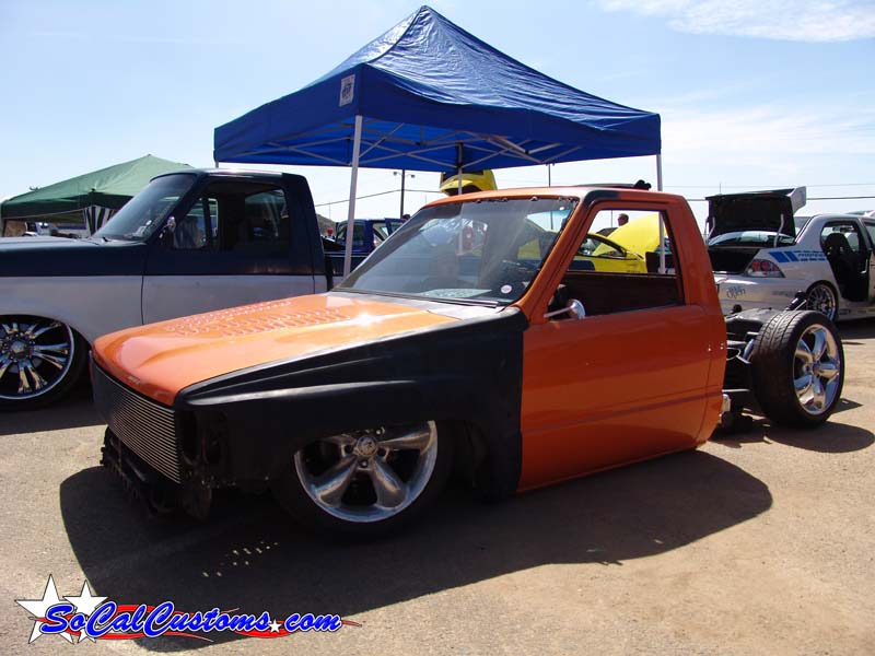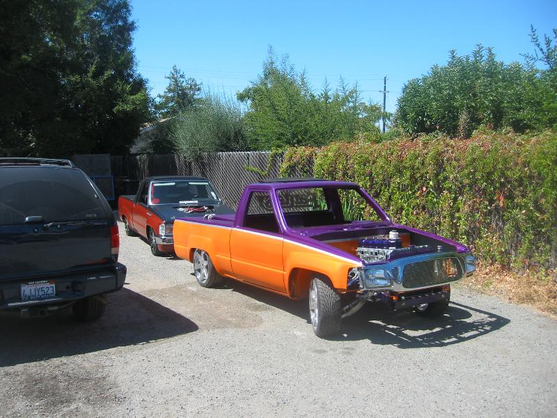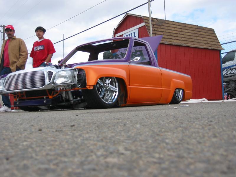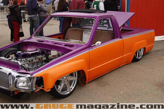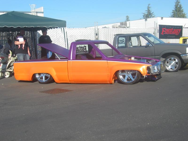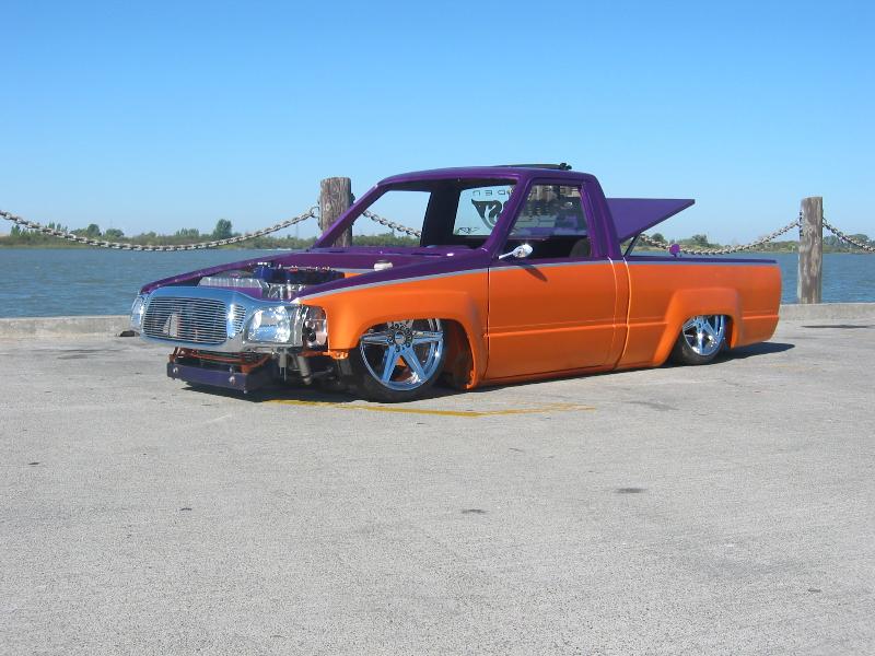 shaved door handles, gas door, taillights,cab side vents, antena ext. ragtop, half capped bed with aluminum tounel cover on air cylinders, custom coresupport to hold the 2003 taco front end, just shaved the firewall and frenched the booster into it 2 inches, capped rear inner fenders, haggon gas door on top of bed, hi- tech leds in top bodyline and trimmed down to look like tear drops, shaved mirrors with a harley davidson mirror, all 4x4 sheetmetal