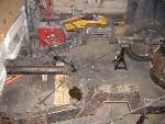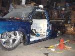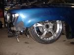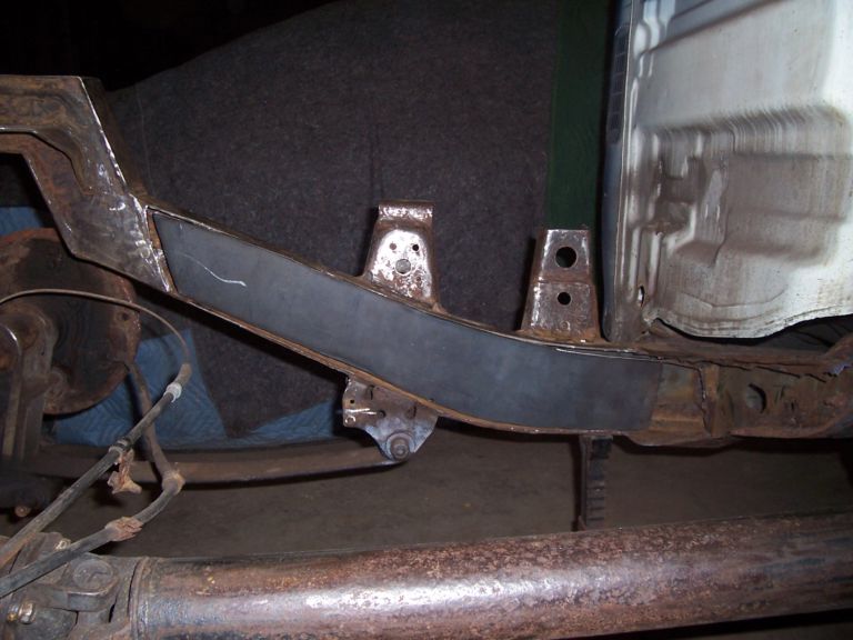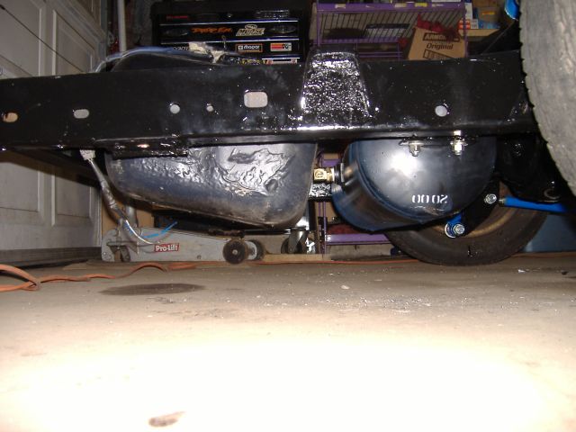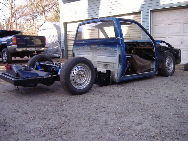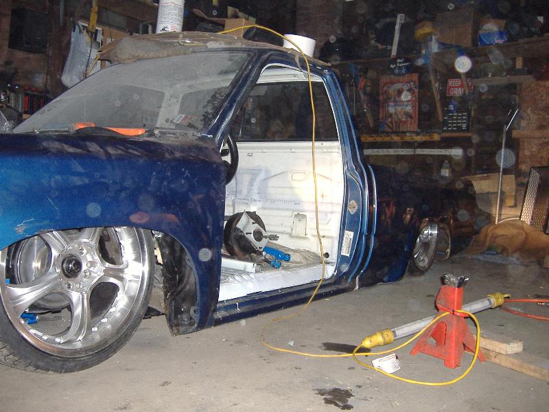new tranny crossmember,some new steel in the rear to fix the rusted out parts of the frame, gas tank relocated to the rear between the frame rails,air tank mounted in the rear between the rails, z'd front clip and body dropped.