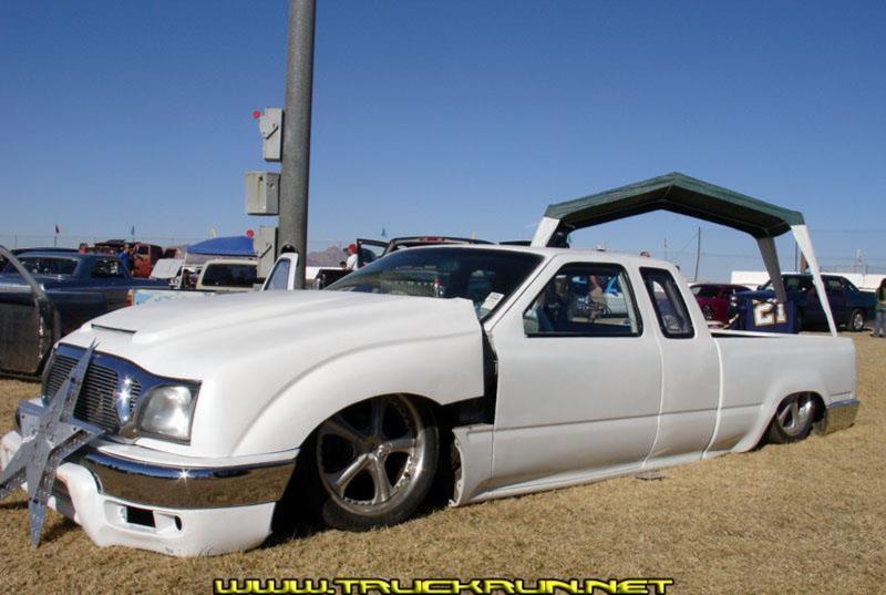 Shaved everything, 2001 Tacoma taillights and tailgate, 2001 Avalon license plate box, Flip frontend,2002 tacoma headlights, grill with billet insert, fenders and hood 89 body style hood was used to make the scoop, shaved corners,03 4 runner bumber and valance, Body dropped 3", Cab back subframe which hold a mazda Rx7 reaerend, fuel cell, skull bag mounts 4" chop in back 4.5" chop in front leaned windshield electric 4runner back window smooth back cab wall