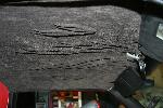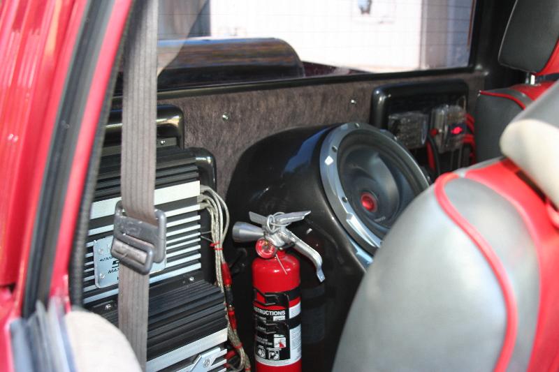 smoothed dash w/ custom gauge insert w/ AutoMeter Phantom gauges, Grant wheel, seat covers, & painted red trim, Odyssey battery relocated to interior, custom console & custom amp & electric panels,custom headliner w/flames laid in