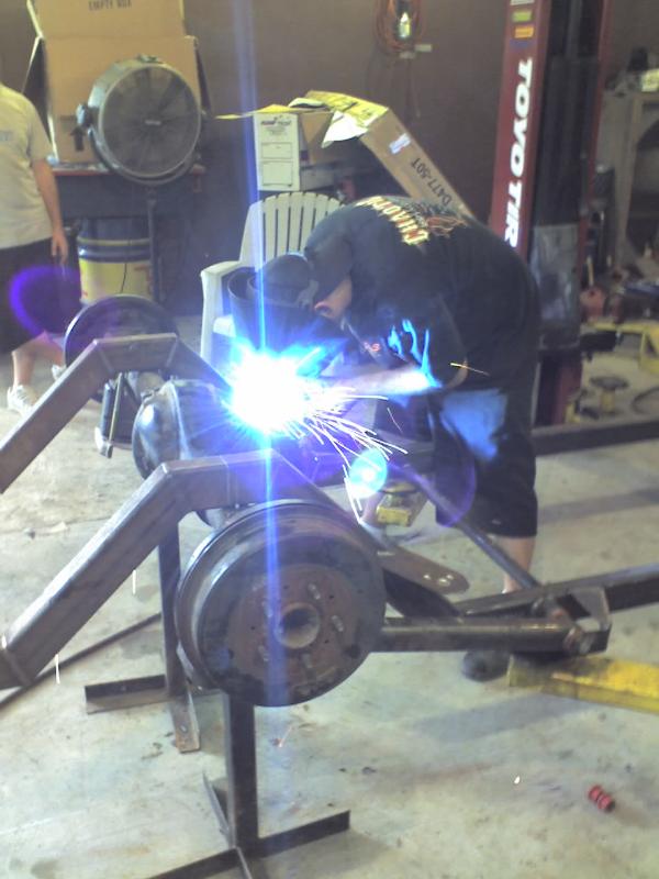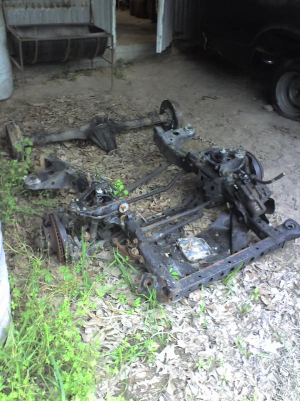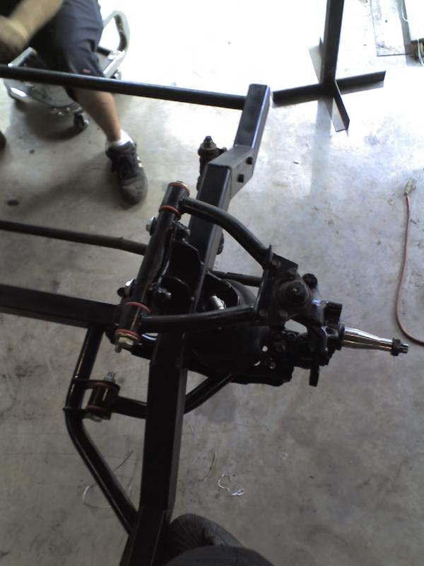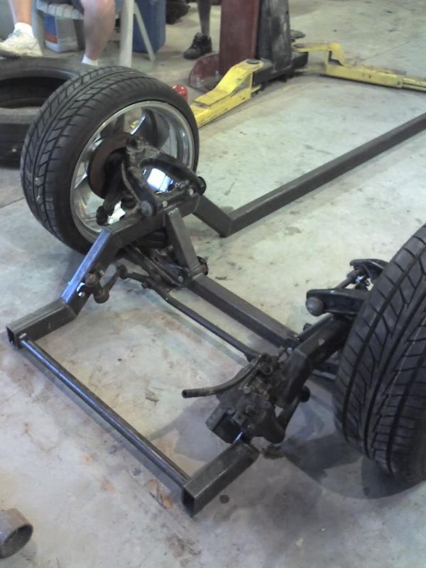 full frame 2x3 box tube,front-tubuler upper control arms, a'd the lower stock arms, belltech spindles and slam bags. rear-93 axle with a 2-link on slams and a custom two piece drive shaft for clearence issues. two viair 480c's with gc valves 5 gallon tank, and aluminum air line.