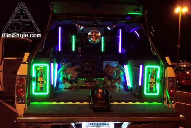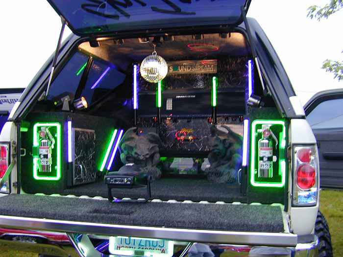 Alpine, Soundstream, Audio Control, 14 speakers 3400 watts, 3 Stinger batteries. Also sports 88 tubes of neon and 50 strobes for now.