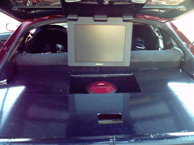 leather headliner with 3d flames, leds, 3 racing black seats and 15 inch flip down screen custom kick panels.