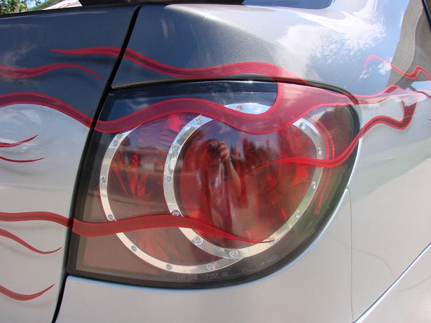 CLEAR TAILIGHTS, UPPER AND LOWER BILLET GRILL, SHAVED EMBLEMS, SHAVED TRUNK, CLEAR HEADLIGHTS WITH FLAMES PAINTED INSIDE, FLAMES IN THE TINT BY PERFECT SYMMETRY, PAINT DONE BY METAL ASYLUMN KUSTOMS (480)213-9618