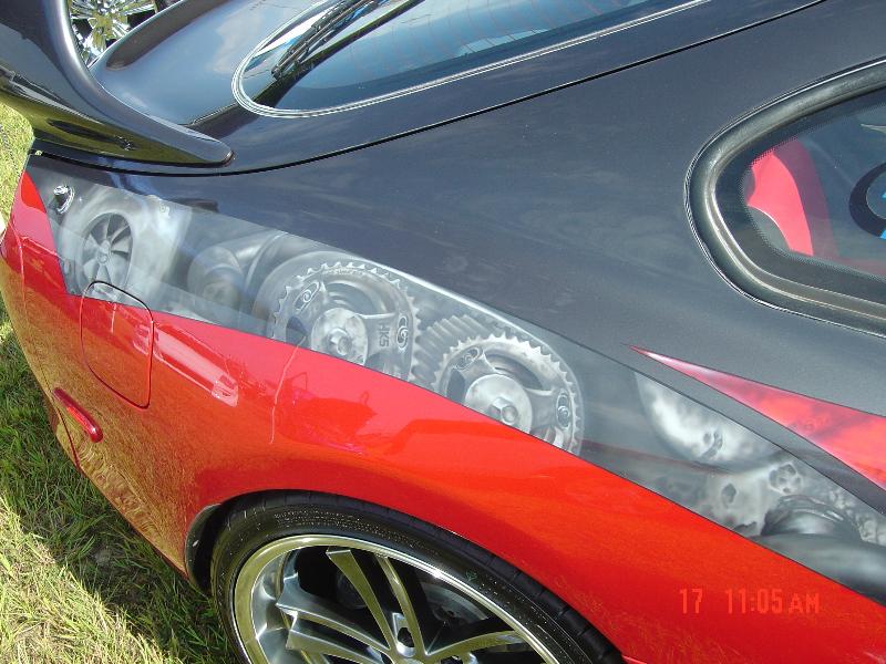 CUSTOM RED AND CHARCOAL PAINT WITH ENGiNE PARTS AIRBRUSHED ON CAR BY MR.SCRAPE CUSTOMS,ROD MILLEN FRONT LIP AND WING,HID HEAD LIGHTS