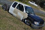 3 ¼ " traditional body drop. Suicide doors. Shaved doors, guards, roof lines, bonnet, tail lights, tailgate, etc. 2003 SR5 Hilux front end conversion. Round LED tail lights in rollpan. False floored tub with hatch.