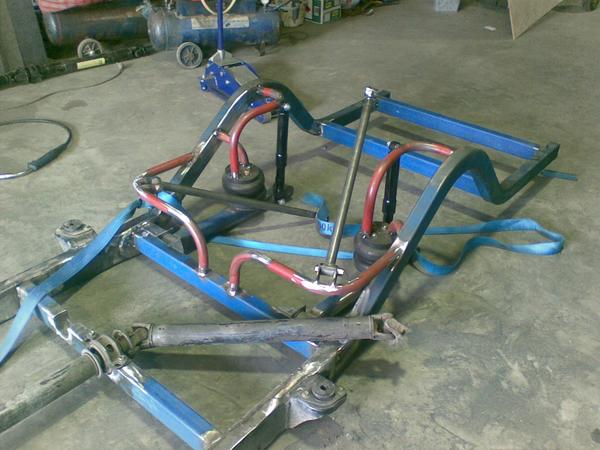 Canti 4 link. Slams all round. McDonald Bros rear clip. Tube arms. Z notch. 2 Viair 480C compressors. Accuair digital ride height control and valve block.