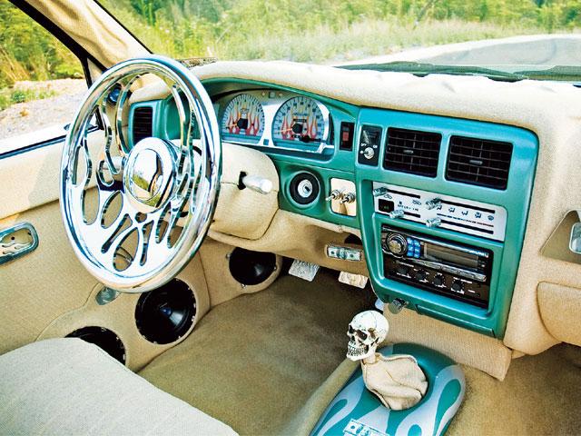 Malibu sand tweed, tons of billet and chrome, one off air gauge mount, embroidered seat, 100 dollar bills and skulls. Fully carpeted with bisquik carpet. Custom fiberglass center console. Hand made door panels that house two sets of audiobahn 6.5 inch 2 way speakers. custom kick panels with 5 and a quarter audiobahn 2 way high's, flamed billet door handles. Raised flames on dash, A-pillers, and door panels. Billet gauge cluster surround, Flamed gauge overlay and all plastic painted to match. Colorado customs billet flamed steering wheel with one off engraved horn button. Custom shortened and bent shifter with hand made skull shift knob.