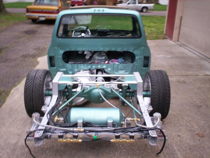 3 and a quarter inch body drop that lays flat rocker with no Z, fully reversed triangulated 4 link that rips my drive shaft out of my transmission and pole vaults me through the air everytime i hit the brakes. 8 inch notch, custom cross members, bagged with 1/2 inch silver parker air line line, 3/8th's airlift valves, 5 gallon tank, 2 smc 3/8th's water traps, 2 viair 380 compressors, RE-6 front and 13inch insane lift rear fag bags! All parker push to connect fittings with absolutely no leaks. Raised gas tank cross member.