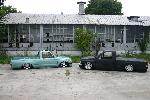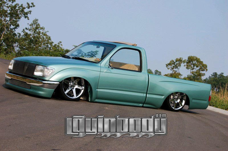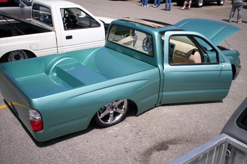 Just repainted AUG 07 custom mix PPG money green. Shaved: handles, gas door, rear cab lines, mirrors, antenna, wiper squirters. Billet mirrors. Molded headlight filler panels to fenders. Molded fenders, Full skin combo. Tan rag top, billet grill, 4 wheel drive chrome bumper, 2 wheel drive valance and billet insert, half cab cut out for stereo, custom one off third brake light, flared bed sides, turn signals moved to side markers, suicide doors with filler panels welded to cab between fender and cab. Full sheet metal bed with radiused rear bed corners and half round metal speaker enclosure.