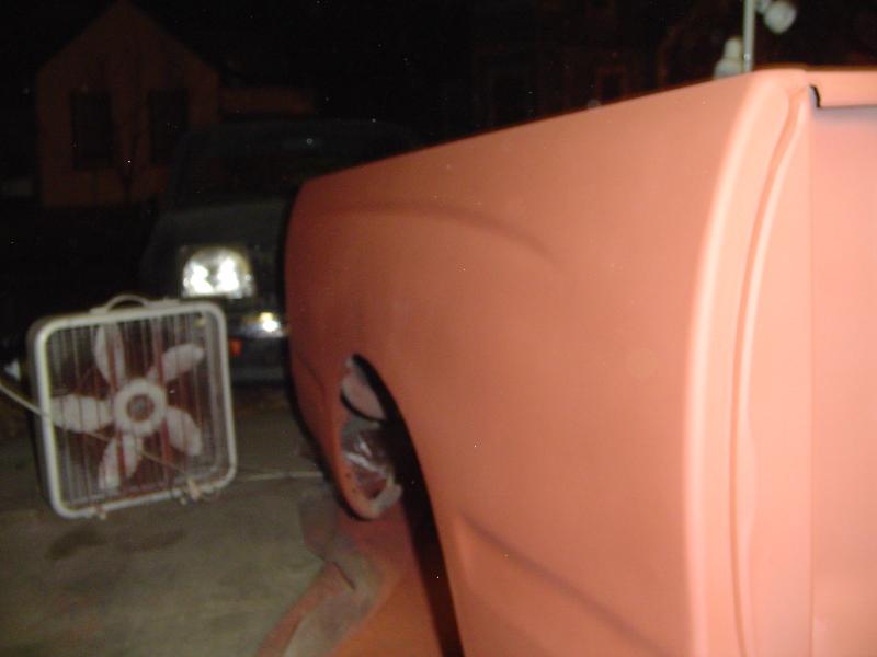oxide red, shaved door handles, antenna, gas door, tail lights, skinned in rear with liscense plate in the roll pan, 2 10" leds in the skin