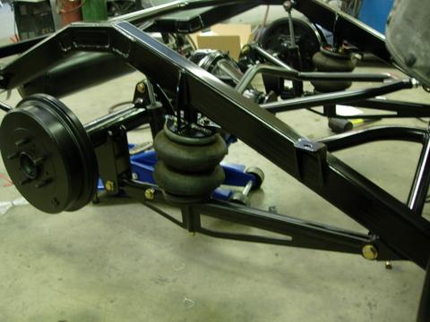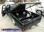Firestone 2600 big bags, custom front bag mount, modified 3/16” plated frame, modified radius arms, DJM upper arms, ½” 350 psi valves, ½” fittings, Reverse bushing modified 4-link, boxed and super notched, custom shock and bag bridge, two firestone 9210 compressors, two Firestone 5 gal. ½” port tanks, custom tuck-up rack, port Doetsch Tech shocks, custom mounts for relocated fuse box and evap canister, Battery & gas tanks relocated to bed, extended wire harness, front wheel wells cut and beaded, cut and tubbed firewall to fit 19’s, Alston tubs, custom hinged bed cover, KP Playstation controller (air)