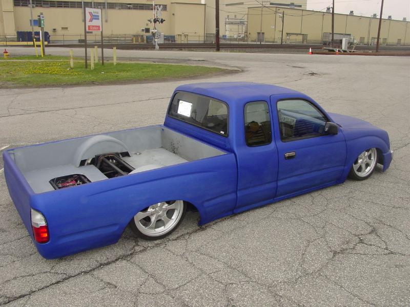 01 front end, lexan rear window w/ license plate, shaved atenna, corner lights, gas door, one piece tailgate/roll pan, so thats a shaved tail gate. red/clear tails. sheet metal bed with custom battery and air tank holder........ hot rod flatz daytona blue paint for now....