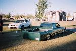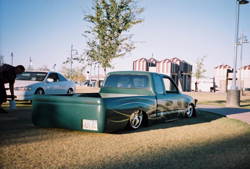 shaved door handles, mirrors, front turn signals, tailgate, tailgate handle, gas door, rocker panels molded together, firewall, third brake light (hump cut out of roof and smoothed back in), smooth bed floor, smooth door jams, tailights (replaced w/ 10" LEDs), lines under rear window, suicide doors, primer and custom graphics (done by john owens & other members of perfect poise), body dropped 4 1/2", smooth bedsides, tubbed(FOR SALE)