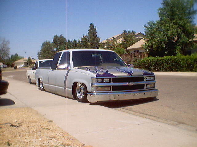 I'm the painter!!!!!!!!!!!!!!!! I'm 26 yrs. old, been married 4, 1 1/2 yrs, been draggn on phoenix 4, 2 1/2 yrs. I own a 89 GMC x-cab fullsize,bridged,bagged,shaved,&b-dropped. But just like any painter, IT'S NOT FINISHED!!!!!!!!!!!!!!! Mywife has a 95 IMPALA SS BLACK with grey leather int., & of corse bumps in the trunk. I'm currently looking 4 a set of DUBS to put on the "SS". stay posted 4 new pics!