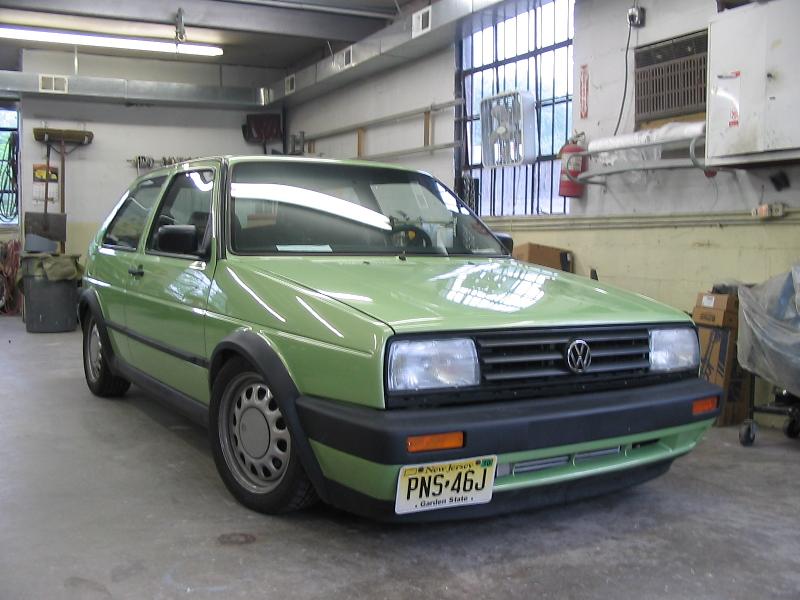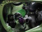 T3/T4 turbo, big ass blowoff, green series intake cones, custom built (by me) intercooler pipes, huge frontmount intercooler, custom made cover for motor taken from new Jetta(cut by me) painted engine compartment. 2003 VW Jetta 1.8T motor. AEM boost guage, fuel pressure reglulator